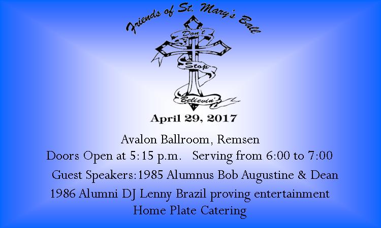 « All Events This event has passed. Friends of St. Mary’s Ball March 31, 2017 @ 9:28 pm « Utility Board Meeting Firemen’s Breakfast » Add to calendar Google Calendar iCalendar Outlook 365 Outlook Live Details Date: March 31, 2017 Time: 9:28 pm