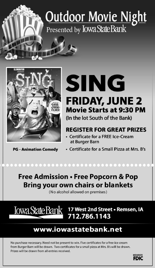 « All Events This event has passed. Iowa State Bank Movie Night April 25, 2017 @ 10:06 pm « Remsen Youth Little League Parade-PPD Iowa State Bank FREE Lunch » Add to calendar Google Calendar iCalendar Outlook 365 Outlook Live Details Date: April 25, 2017 Time: 10:06 pm