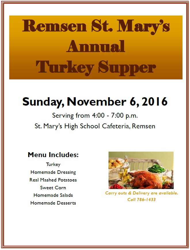 « All Events This event has passed. St. Mary’s Turkey Supper October 28, 2016 @ 4:19 pm « Chamber Businesses “Trick or Treat” Chamber Bowling » Add to calendar Google Calendar iCalendar Outlook 365 Outlook Live Details Date: October 28, 2016 Time: 4:19 pm