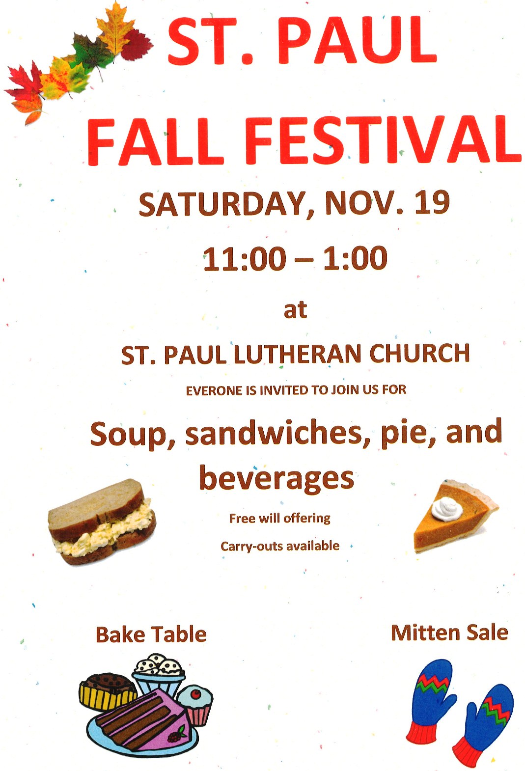 « All Events This event has passed. St. Paul Fall Festival November 1, 2016 @ 1:47 pm « COF Breakfast & Bake Sale Library Creative Spirits » Add to calendar Google Calendar iCalendar Outlook 365 Outlook Live Details Date: November 1, 2016 Time: 1:47 pm